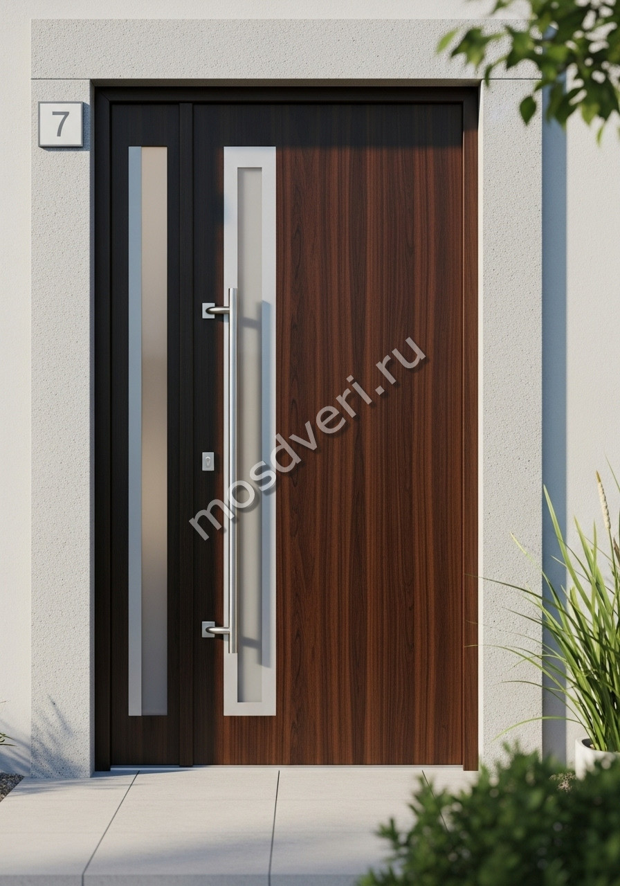 Дизайнерская входная дверь коричневая со стеклом — совмещает современный дизайн и максимальную защиту.
